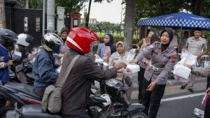 Surabaya – Personel Direktorat Lalu Lintas Polda Jatim membagikan 300 takjil bagi masyarakat pengguna jalan di Depan Mapolda Jatim, Jalan A Yani 116 Surabaya