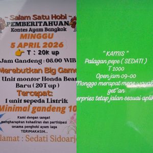Sidoarjo – Praktik perjudian terorganisir di Dusun Wagir, Desa Pepe, Kecamatan Sedati, seolah menjadi wilayah “kebal hukum”. Meski instruksi Kapolri Jenderal Listyo Sigit Prabowo tegas untuk memberantas segala bentuk perjudian, namun di wilayah hukum Polresta Sidoarjo, aktivitas judi sabung ayam, dadu, dan cap jiky justru tumbuh subur dan menantang kewibawaan korps Bhayangkara.